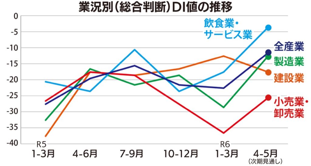 次期見通しについては、総合業況DIはマイナス12で今期から11ポイント改善の見込み。飲食業・サービス業は今期から14ポイント増のマイナス4と大幅に改善すると見込まれている。製造業、小売業・卸売業も大幅に改善する見込み。一方、今期は比較的好調だった建設業については若干の悪化が予想されている。