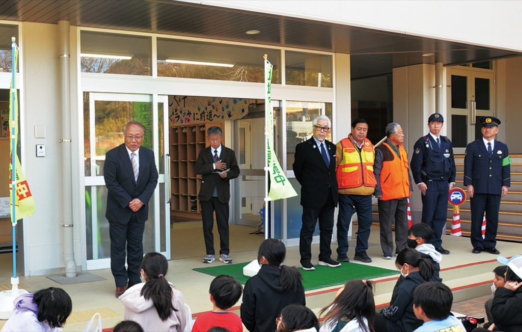 出発式では、下校前の学園生に平隊長があいさつ。「家の人たちは、みんなが1日元気で過ごせると良いなと思って送り出し、帰りを待っている。そして、たくさんの地域の大人がみんなのことを元気に健やかに過ごしてほしいと願っている」と子どもたちへの思いを伝えた。そして、「見守り隊には、たくさんの人が協力してくれた。皆さんも自分を見守る行動を考えてみてほしい」と話した。