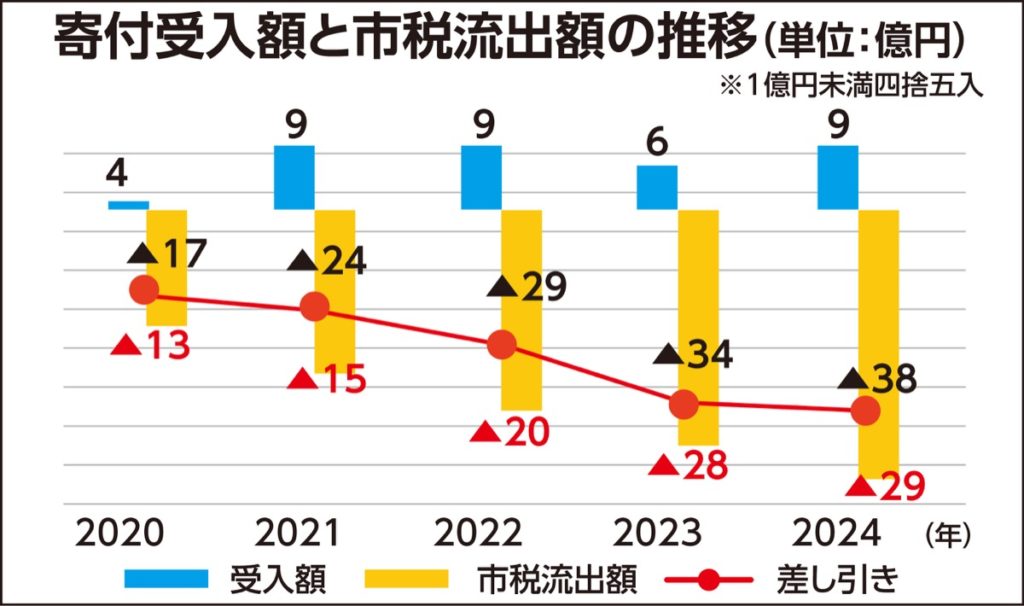 ふるさと納税制度による市税の流出が課題となる中、相模原市の寄付受け入れ額から流出額を差し引いた額が流出超過約29億円に上ることが総務省の調査でわかった。制度に伴う市の2025年度住民税控除額(流出額)は過去最多の約38億円。返礼品や寄付方法の充実で相模原市への「返礼品つき」の寄付額は前年度から約2億円増加したものの、流出額との差は広がっている。