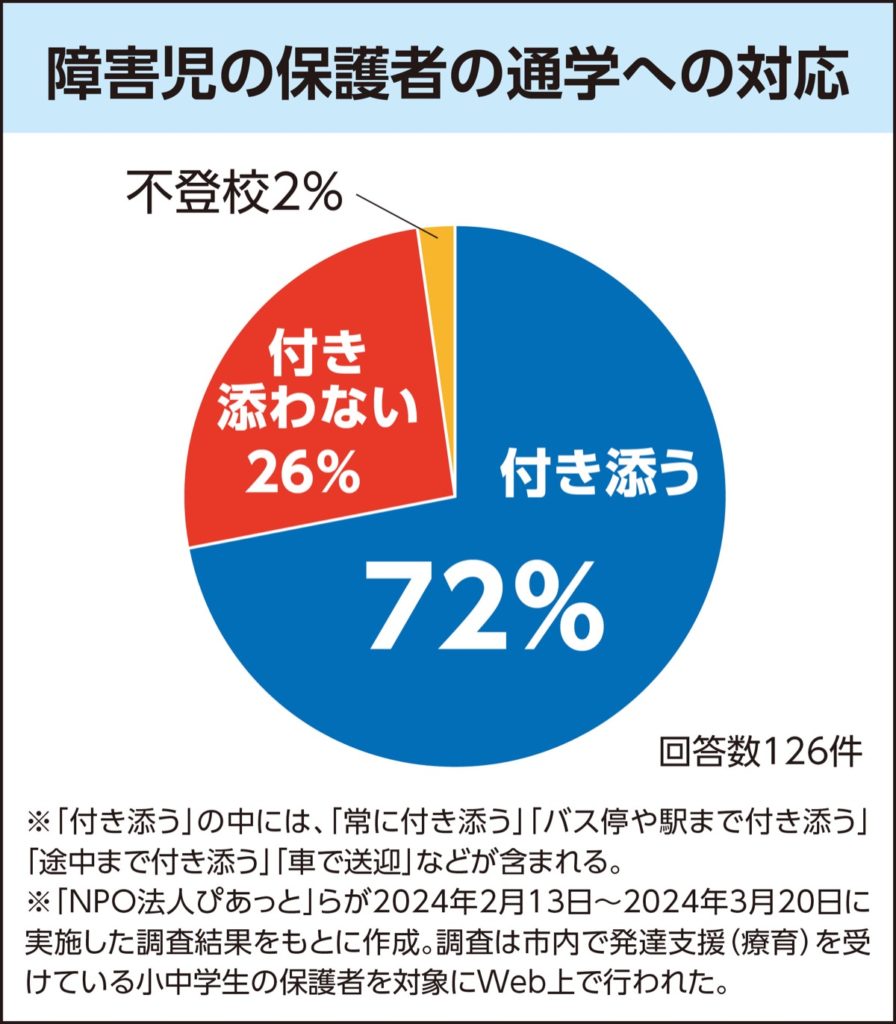 見えにくい障害も診断されるようになったことなどの影響で相模原市内の障害児の数は年々増加しており、2025年4月1日時点の身体・知的障害児は3110人。障害がある子どもは通学に支援が必要な場合が多く、市内で発達支援(療育)を受けている小中学生のうち72%が保護者の付き添いのもと通学しているという調査もある。保護者たちは送迎のために勤務時間の調整や就労の断念を余儀なくされている。