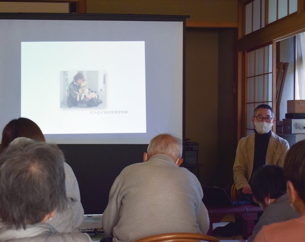講演会の冒頭、イヌの習性や起源についてイラストや動画を用いて解説。ヒトとイヌが心のつながりを持てるということについて、生物学的な絆の証明として脳内で分泌されるホルモン「オキシトシン」が関係していると説明。「イヌと暮らすことが健康に良い影響があり、イヌと触れ合うことでオキシトシンが分泌される。健康にもよい作用があり、気持ちも落ち着くようになる」と話すと、参加者はメモのペンを走らせていた。