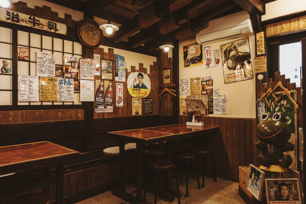 どこか懐かしい趣のある扉を開けると、まるで昭和にタイムスリップしたような空間が広がる、「か印上溝商店。」。遠い昔に見たような看板やゲーム、グッズの数々が飾り付けられた店内は、心地よいレトロな雰囲気が漂い、日々の喧騒を忘れさせてくれます。
